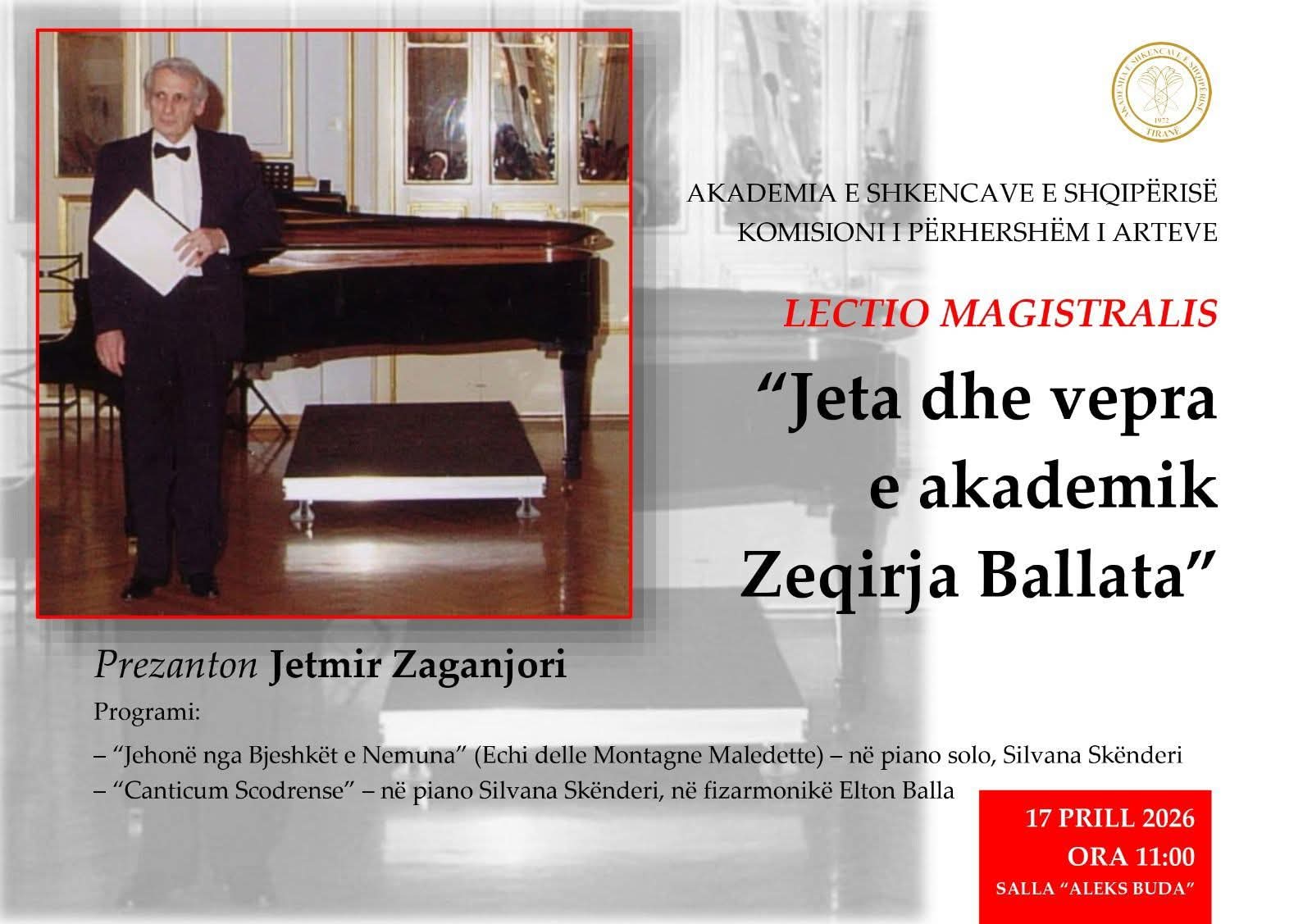 Më 17 prill 2026, në orën 11:00, në sallën “Aleks Buda”, Akademia e Shkencave e Shqipërisë ju fton në Lectio Magistralis kushtuar figurës së shquar të akademikut Zeqirja Ballata, prezanton Jetmir Zaganjori.