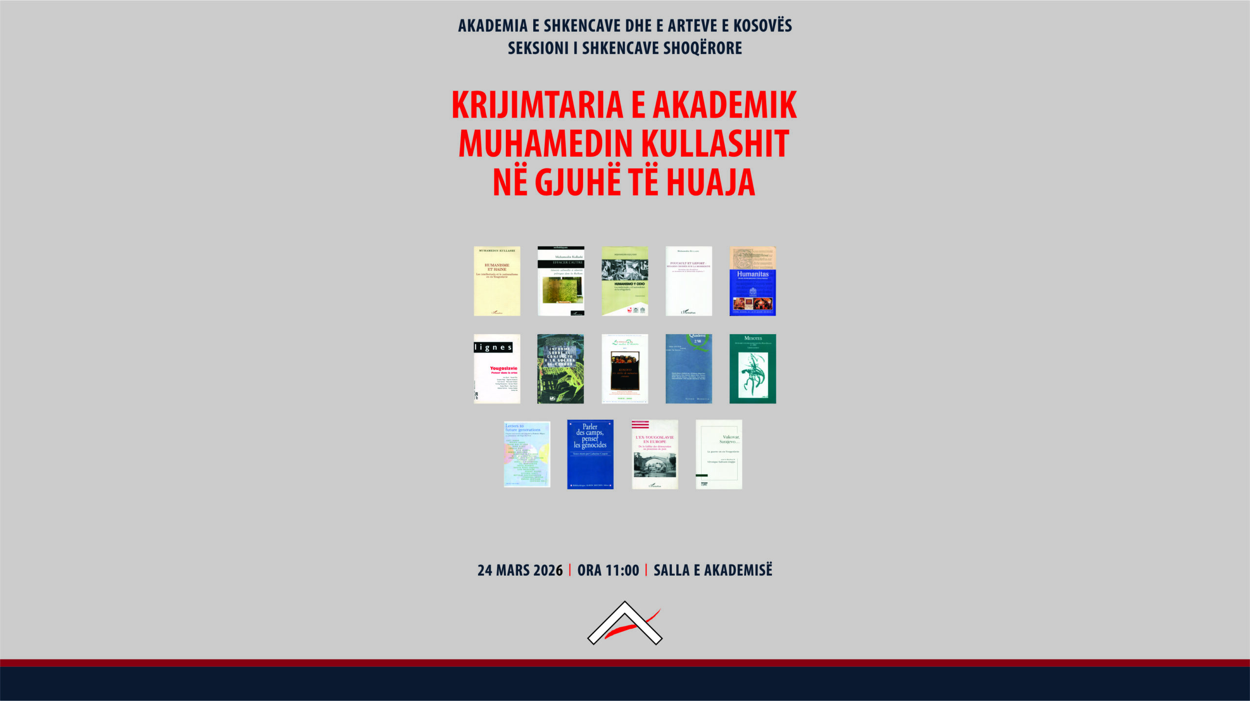 Sot me 24.03.2026, Seksioni i Shkencave Shoqërore i Akademisë së Shkencave dhe Arteve të Kosovës organizoi aktivitet promovues me titull: “Krijimtaria e akademik Muhamedin Kullashit në gjuhë të huaja”.